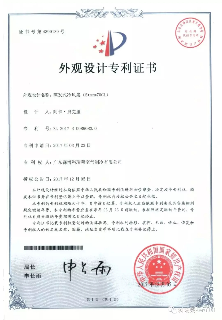 近期,科瑞萊冷風扇產品"風暴"憑借精美的外觀和優良的品質,榮獲國家知識產權局頒發的外觀設計專利證書。